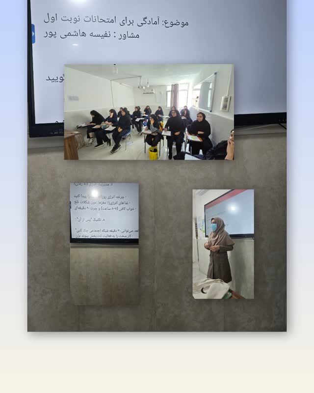 این کارگاه توسط مشاور مدرسه نفیسه هاشمی پور جهت آمادگی دانش آموزان و برنامه ریزی اصولی در زمان امتحانات و چگونگی مدیین زمان برگزار شد