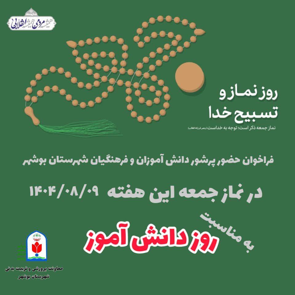 ❇️در راستای پاسداشت این ایام ارزشمند و بهمنظور تقویت روحیهی ولایتمداری، مسئولیتپذیری و بصیرت انقلابی در بین دانشآموزان عزیز، از کلیهی دانش آموزان و فرهنگیان دعوت میشود تا در نماز جمعهی این هفته در مصلی بوشهر، با حضور منسجم، پرشور شرکت نمایند.
