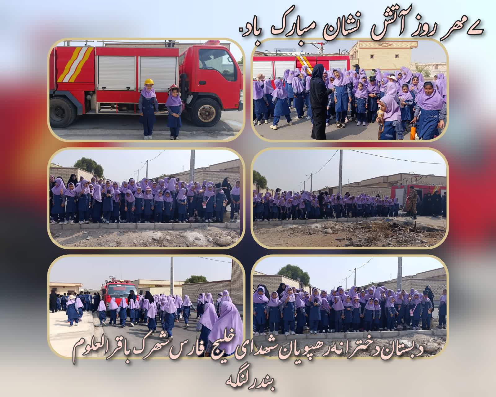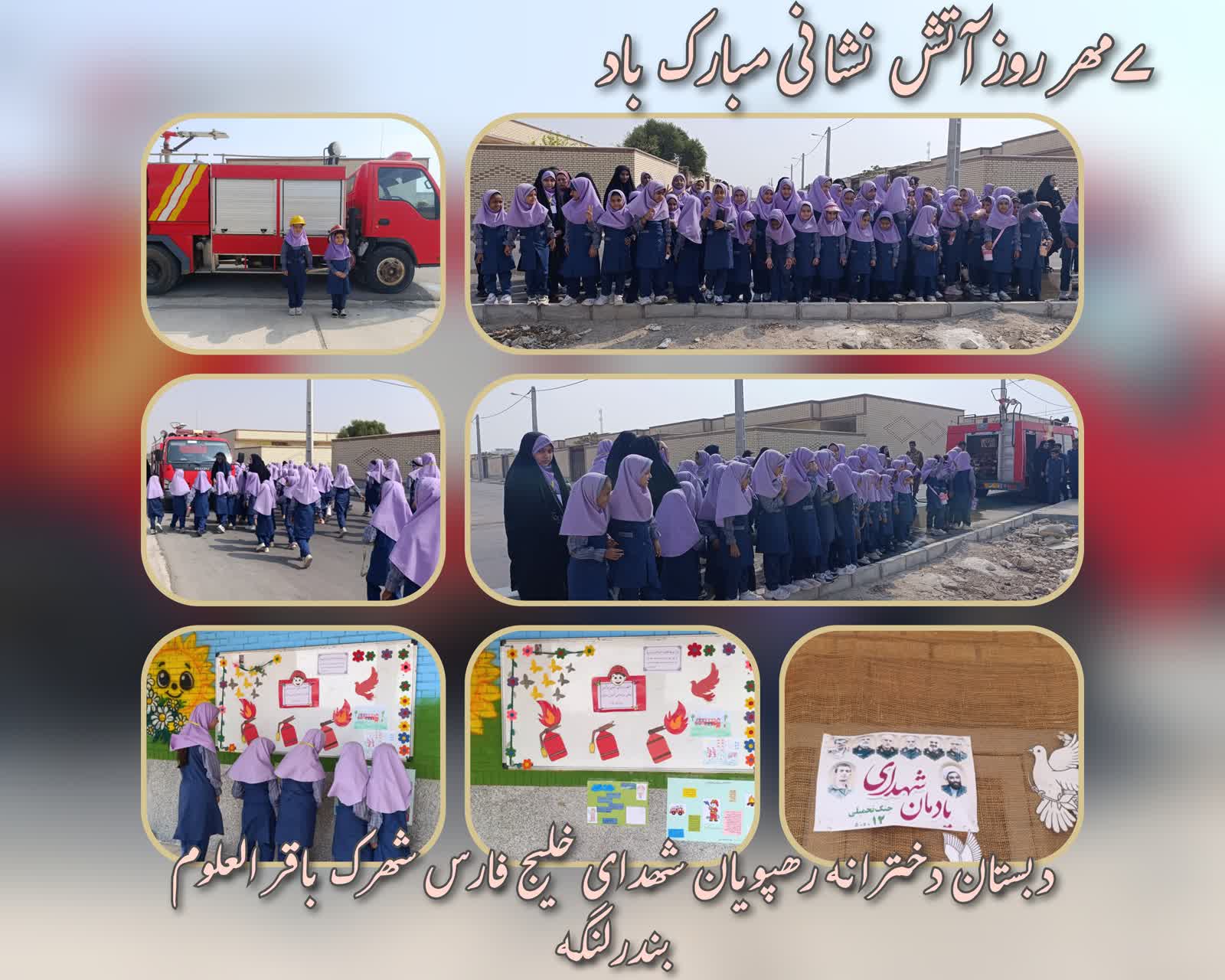 حضور آتشنشانان منطقه در مدرسه به مناسبت روز آتش نشانی و صحبت در مورد زمانی که حریق شد چاد باید کنیم و آتشنشانی مختص آتش نیست اگر گیر کردیم در خانه و یا موجودی مثل مار بود به آتش نشانی تماس میگیریم